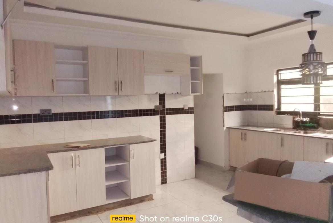 Three Bedrooms Bungalow Sale Kitengela flat roof built up area 145 Sqmtrs,Gated Community of 7 houses, spacious Kitchen with Fitted Cabinets, provisions for intercom, internet n satellite,500 Mtrs off the tarmac,50×100 own compound,open plan kitchen , street lights, Freehold title